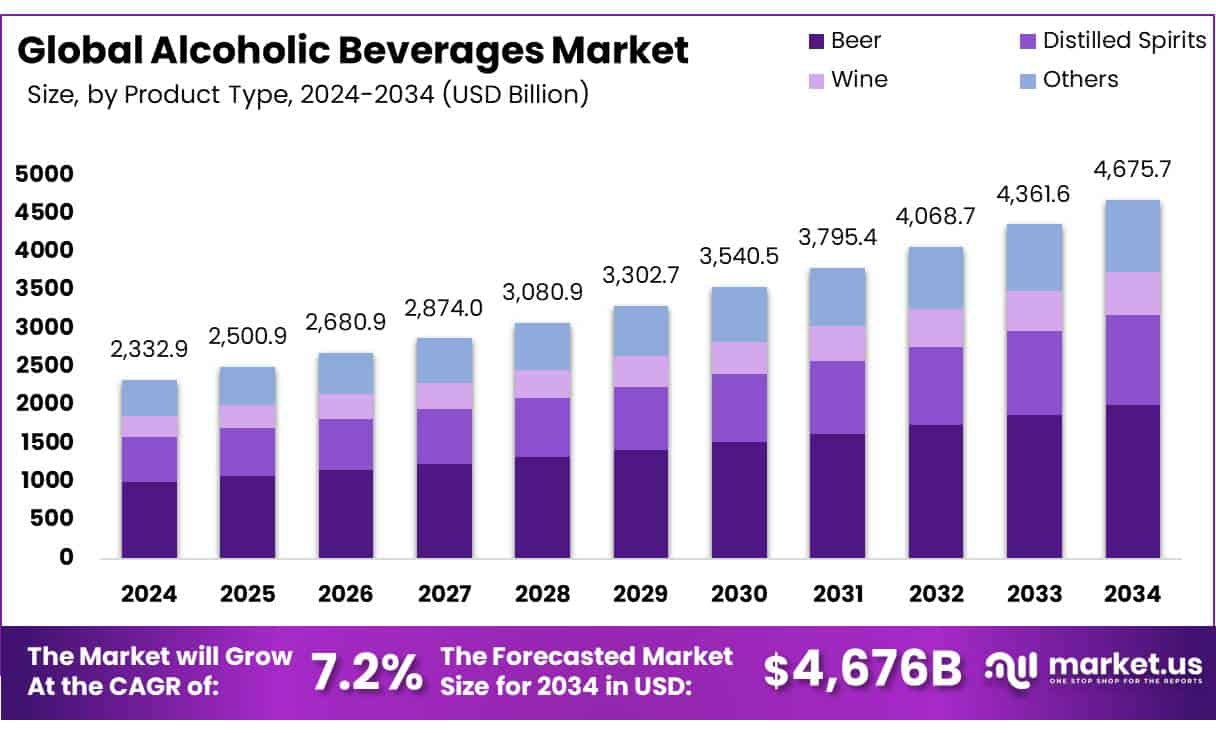The global alcoholic beverages market is projected to reach approximately USD 4,675.7 billion by 2034, rising from USD 2,332.9 billion in 2024, with a compound annual growth rate (CAGR) of 7.2%