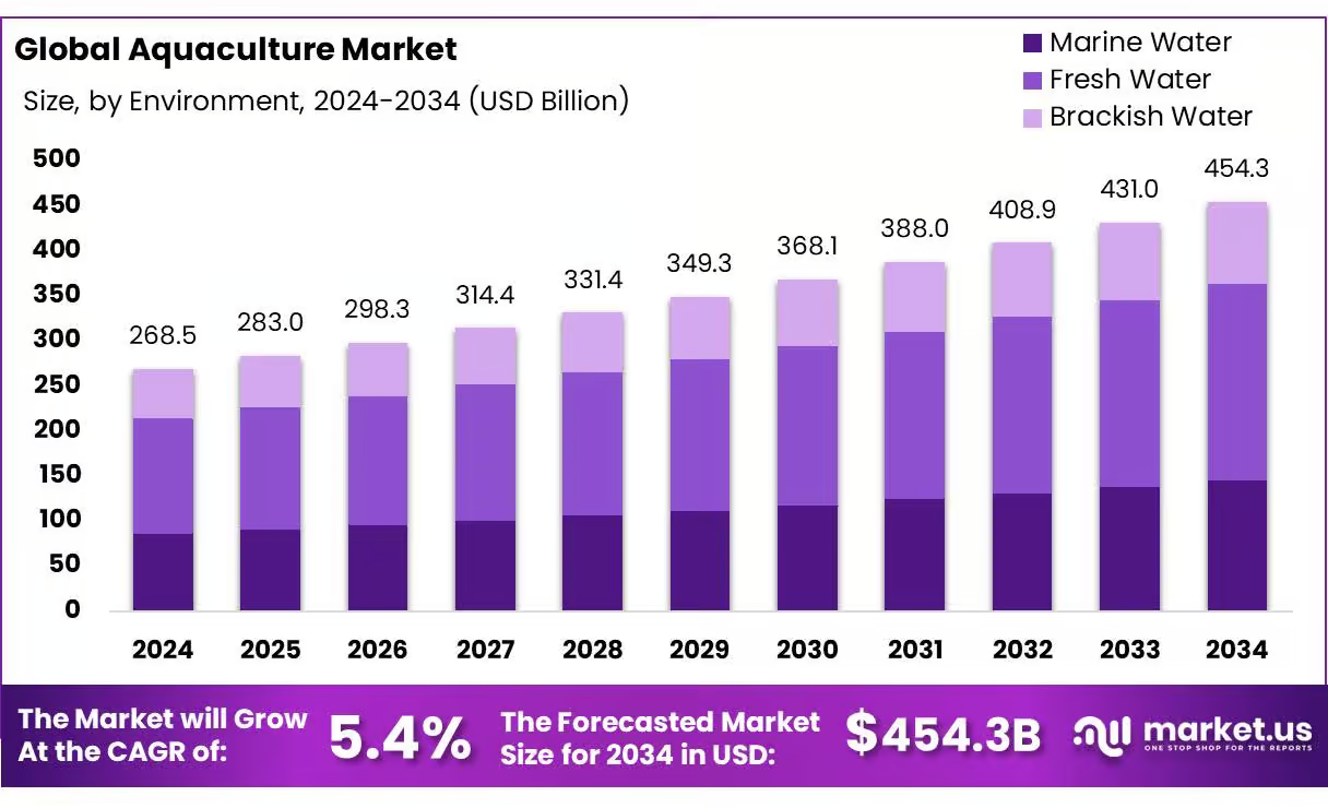 The global aquaculture market is projected to reach approximately USD 454.3 billion by 2034, up from an estimated USD 268.5 billion in 2024. This growth reflects a compound annual growth rate (CAGR) of 5.4% over the forecast period from 2025 to 2034.